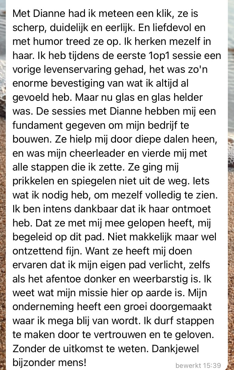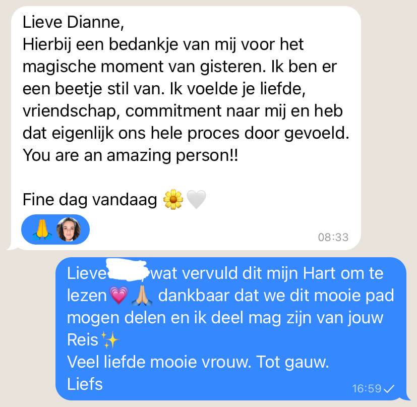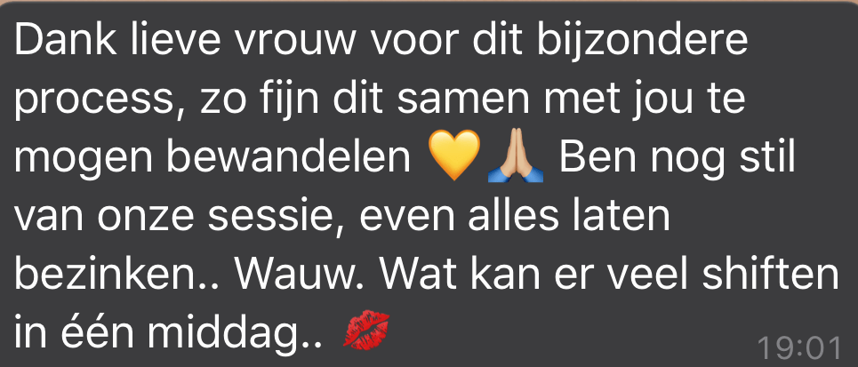 Dit is geen sessie in kennismakings energie. Je ontvangt een volledige sessie van 1,5uur, in de High End energie zoals je die ook ontvangt in mijn 1-1 Mentoring Traject.
