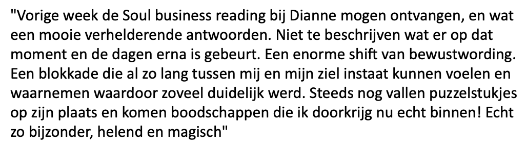 ✓ Dianne deelt de boodschappen die ze voor jou doorkrijgt (van jouw Ziel, de Bron en haar Ziel Mya) via haar helderziende, -voelende, -horende en -wetende gaves.